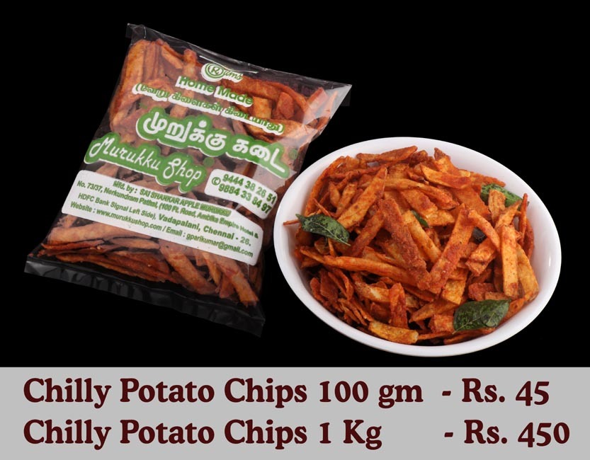 At Annachi Murukku Shop, we bring you the true essence of South Indian snacking with our Chilly Potato Chips — a fiery and flavorful treat loved by snack enthusiasts across Chennai. Crafted using carefully selected fresh potatoes, each slice is thinly cut, perfectly fried in refined oil, and coated with a special blend of red chilli powder, salt, and secret house spices that define our signature taste.